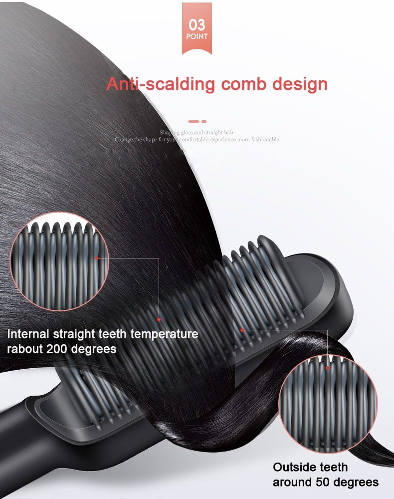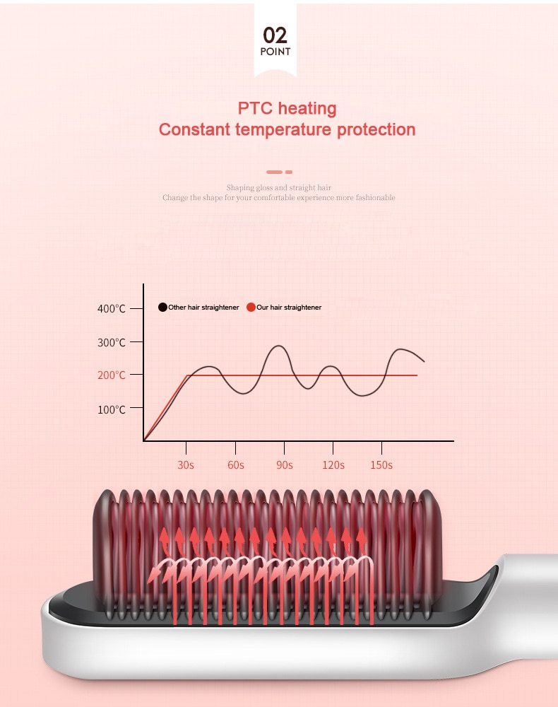1. Quick heating, 15 seconds can reach 200 C. Short time can make a variety of fashion models, 15 seconds to warm up.This revolutionary Hair Brush Comb will have your hair straight, silky and soft within minutes!