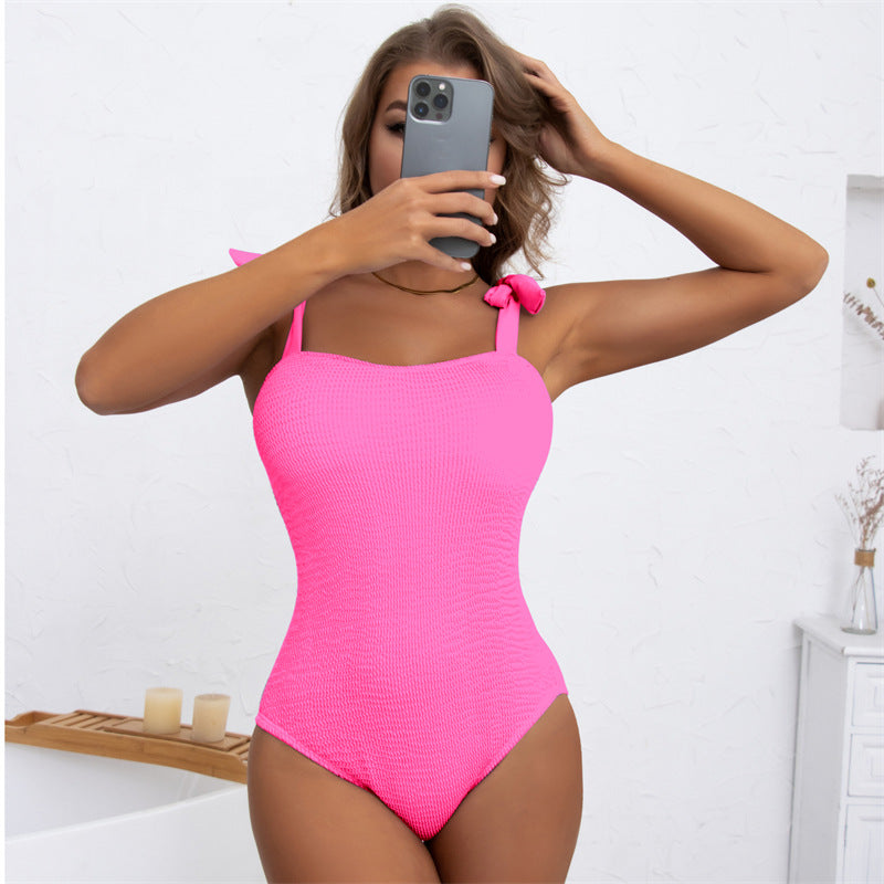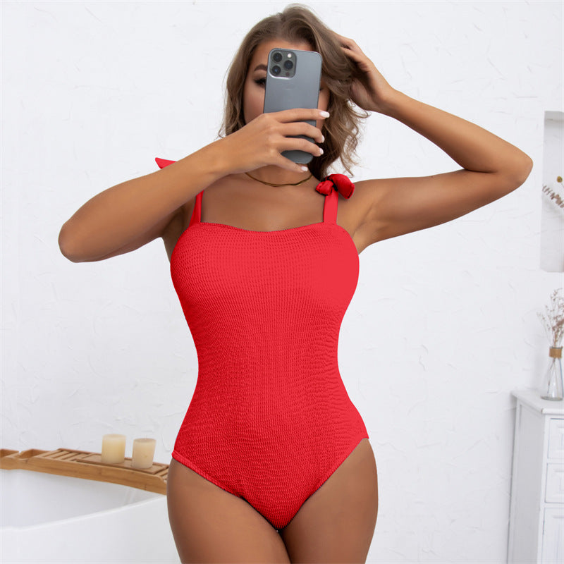 Women's Pleated Wave Cloth Pure Color Tied One-piece Swimsuit